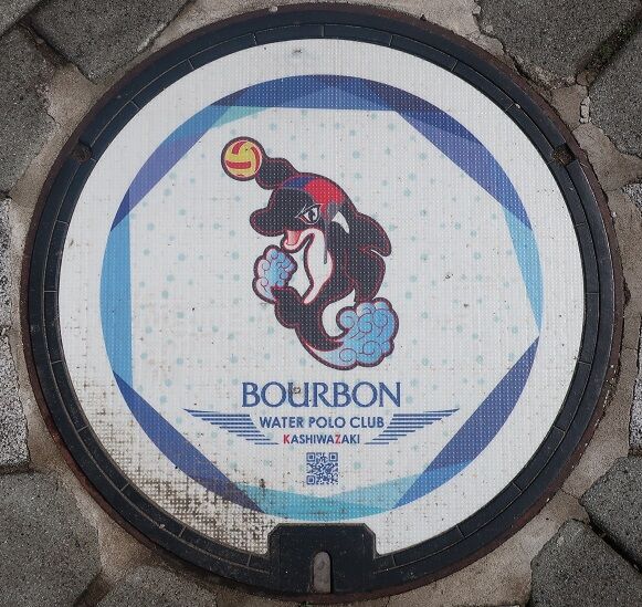 次の蓋と共に「ブルボンウォターポロクラブ柏崎」のマスコットキャラクター「シャチ」がデザインされています。「㈱ブルボン」の前の歩道に有りました。