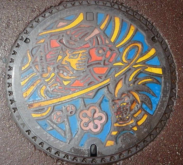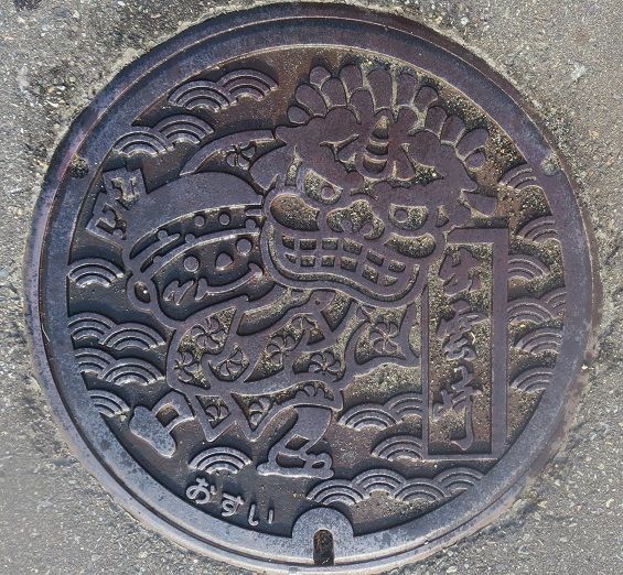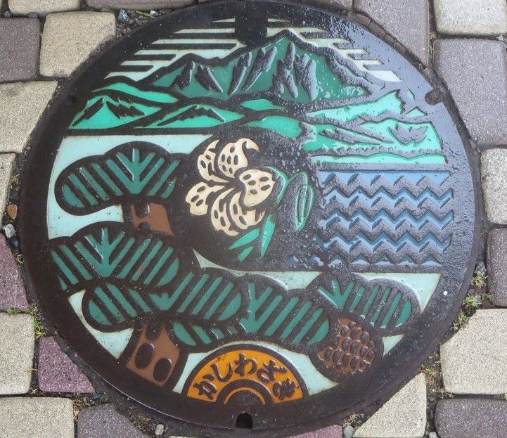 柏崎シティセールスシンボルマークの蓋です。市のシンボルキャラクターの「えちゴン」と日本海に沈む夕日、夏の「ぎおん祭り」の最終日を飾る海の大花火、米山と米山大橋、茅葺屋根のある田園風景、伝統芸能の「綾子舞」がてんこ盛りにデザインされています。みなとまち海浜公園東のセブンイレブン角の信号交差点に有りました。
