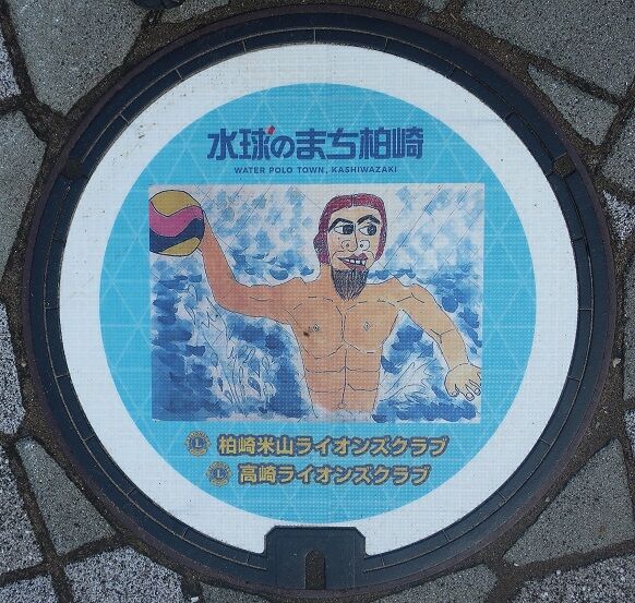 世界に誇れる「水球のまち」を目指しています。力強くシュートする選手がデザインされています。「柏崎信用金庫」の横の歩道に有りました。