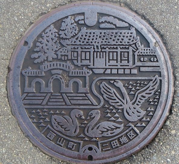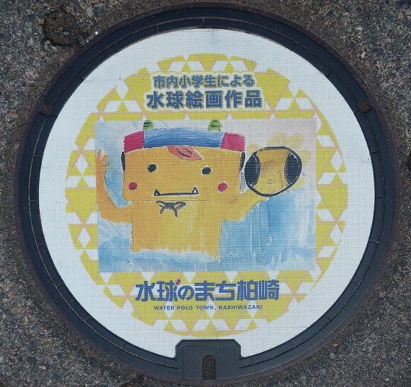 次の6枚の蓋と共に小学生が描いた水球の絵がデザインされています。「ホテルアルファワン」への入口の歩道に有りました。