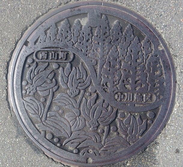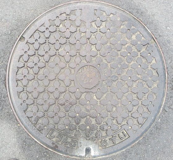 市の花山百合と市の木松、米山、日本海がデザインされています。次の2枚の蓋と共にJR信越本線柏崎駅前通りの歩道に有りました。